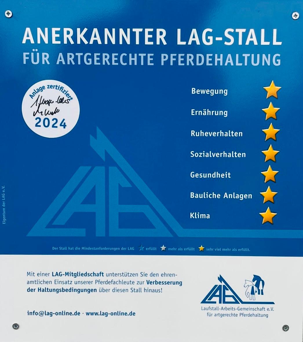 ein Qualitätsbeweis, denn die LAG-Plakette bekommen nur Ställe, die alle Mindestanforderungen der LAG erfüllen
