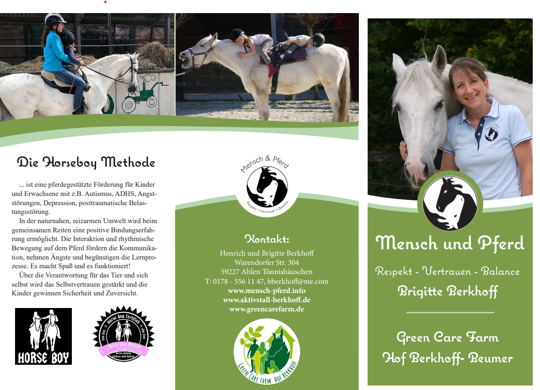Horse Boy Methode, ist eine empirisch und wissenschaftlich belegte Intervention zur Kommunikationsverbesserung und Optimierung der Vernetzungsmuster des Gehirns. Nicht nur für Menschen des autistischen Spektrums, Kinder mit ADHS-Diagnose (Aufmerksamkeitsdefizit- und Hyperaktivitätssyndrom), Menschen mit Angststörungen z.B. bei Posttraumatischer Belastungsstörung und mit anderen neurosensorischen Bedürfnissen sind eine Zielgruppe. Wir arbeiten mit spezifischen Bewegungen von Pferden, die die lernbezogenen Hirnbereiche aktivieren und einer naturnahen Umgebung, die weitestgehend frei von sensorischen Belastungen ist. Die Ergebnisse sind immer wieder atemberaubend. Mit dieser Methode können wir Kindern im Erwerb sozialer Kompetenz, spezifischer Lebensstrategien, Fein- und Grobmotorik und dem Erwerb schulischer Inhalte unterstützen.