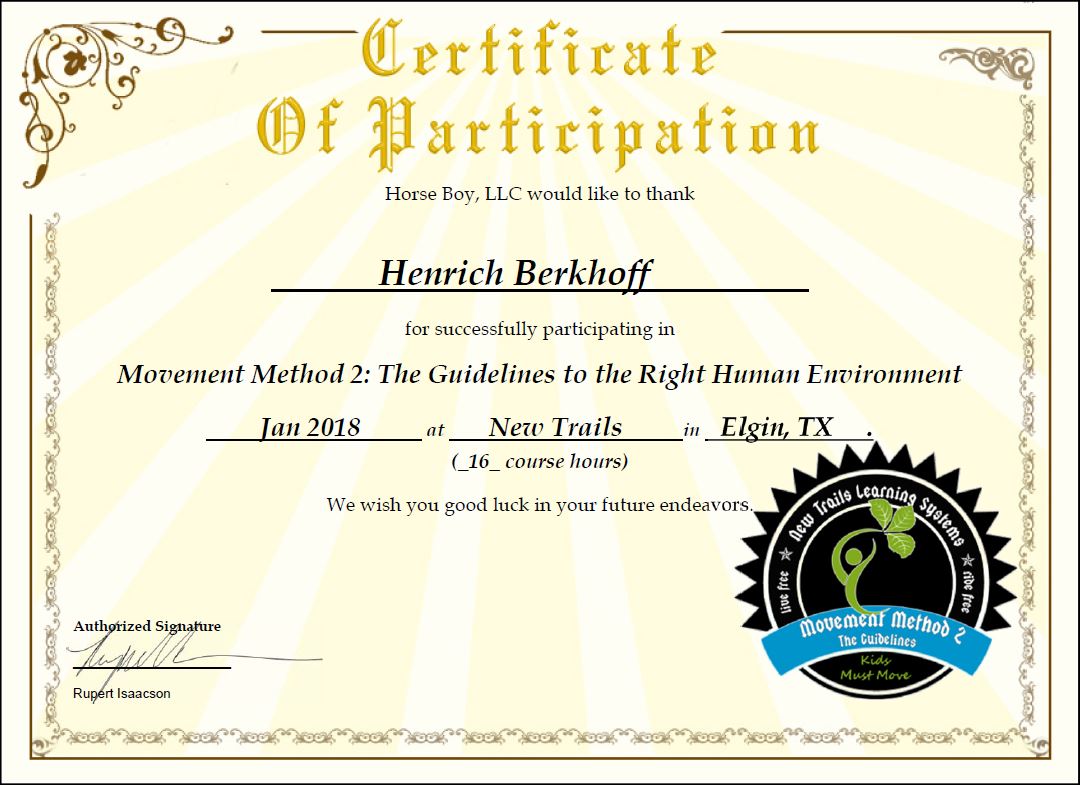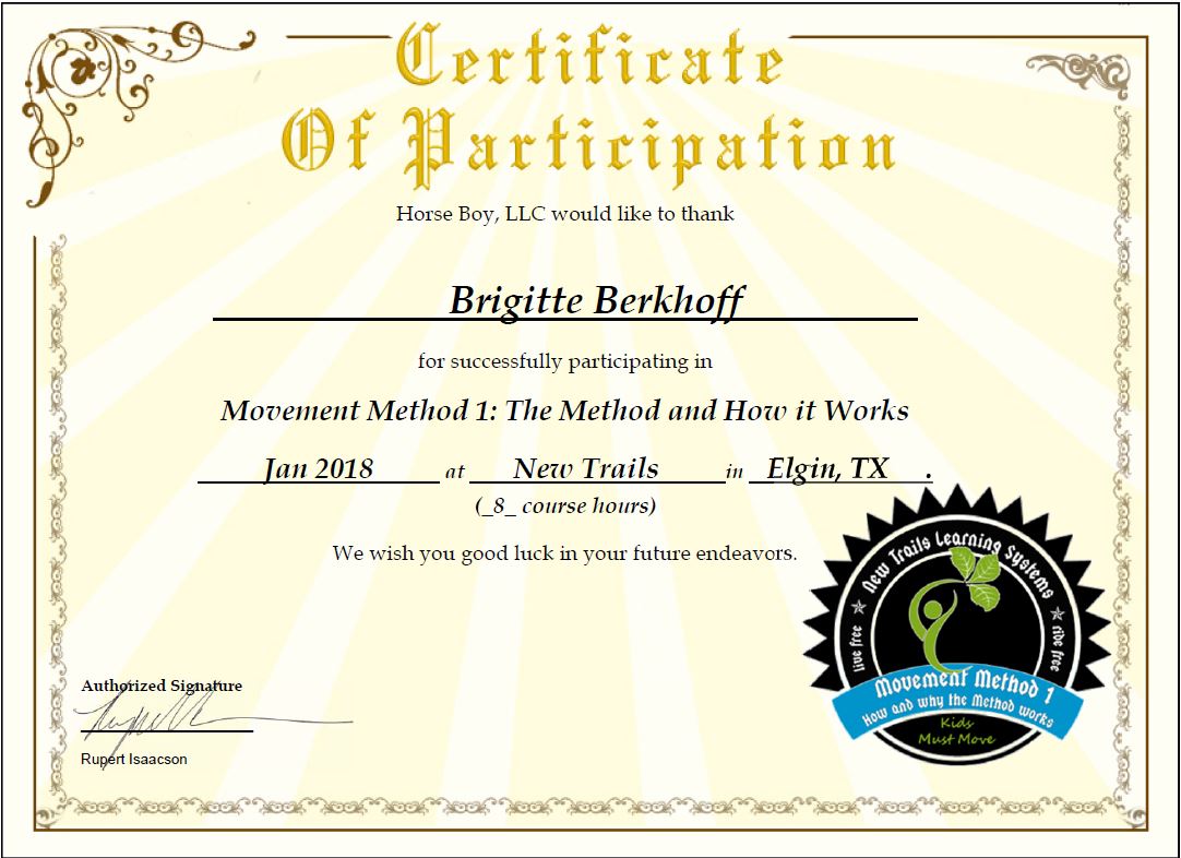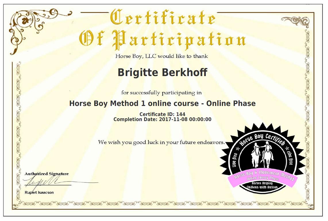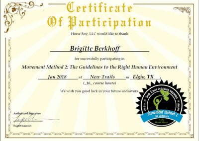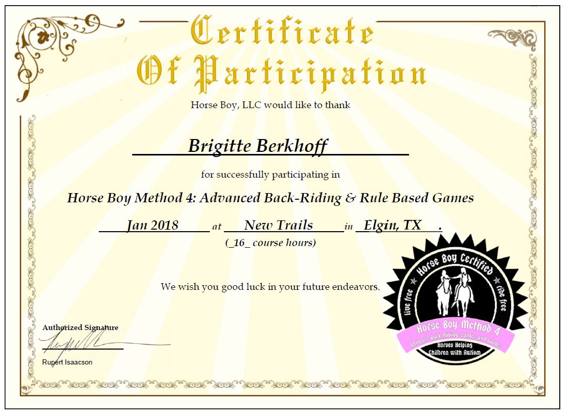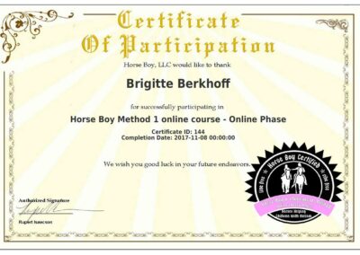 Ich freue mich über die nächste Stufe der Horse Boy Arbeit. Es ist eine große Bereicherung für meine tägliche Arbeit mit Kindern und auch Erwachsenen, egal mit welchen Bedürfnissen. Ich finde es so faszinierend, dass Tiere, hier im besonderen die Pferde, dem Menschen so gut helfen können. Ich danke dem fantastischen Team von Horse Boy für die super Unterstützung und freue mich auf viele weitere Stunden in dem Programm.